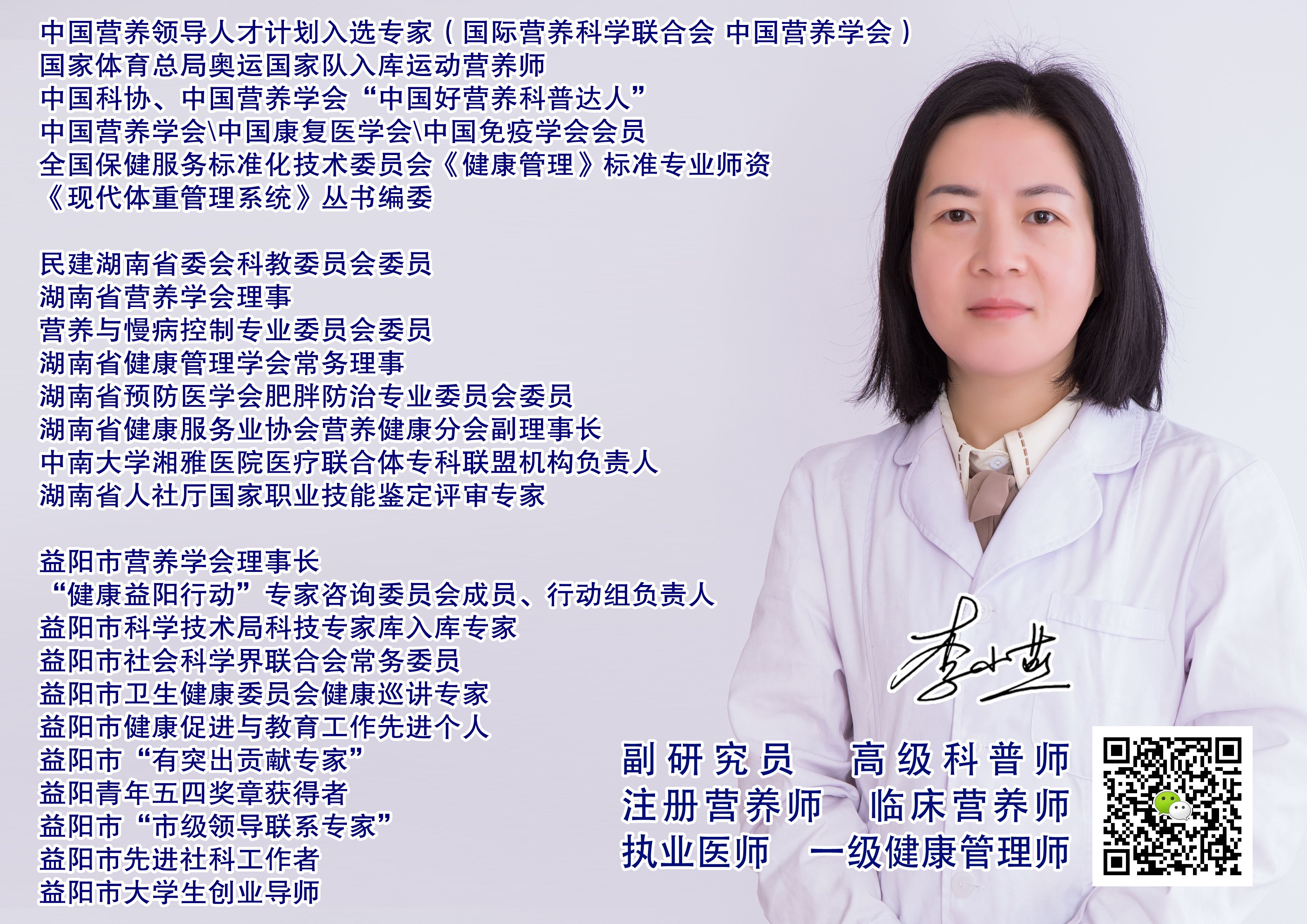 李小燕,副研究员(高级科普师),临床执业医师,注册营养师、国家一级健康管理师,全国保健服务标准化技术委员会“健康管理”标准专业师资。是中国民主建国会会员,民建湖南省委会科教委员会委员,民建益阳市委会参政议政委员会委员。系中国营养学会会员,湖南省营养学会理事,湖南省预防医学会肥胖防治专业委员会委员,湖南省健康服务业协会营养健康分会副理事长,湖南省健康管理学会常务理事,中南大学湘雅医院医疗联合体肥胖糖尿病专科联盟机构负责人,益阳市科学技术局科技专家库入库专家,益阳市社会科学界联合会常务委员,益阳市营养学会理事长,益阳市赫山区政协委员。为国际营养科学联合会和中国营养学会联合认证的中国营养领导人才计划入选专家,国家体育总局奥运国家队入库运动营养师,中国科学技术协会、中国营养学会“中国好营养科普达人”。